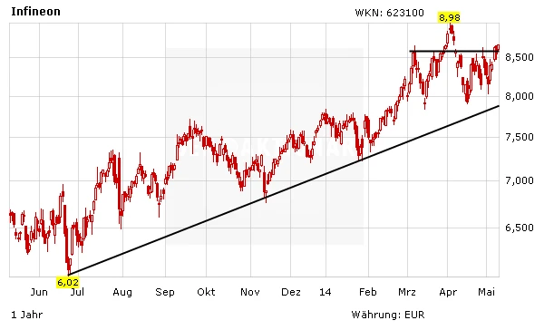 Infineon konnte die Marktteilnehmer zuletzt mit einem durchwegs positiven Newsflow überzeugen. Dank der Erholung an Europas Automärkten übertrafen die Zahlen zum zweiten Quartal die Markterwartungen. Verglichen mit dem ersten Quartal hatte Infineon zwischen Januar und März den Umsatz um sieben Prozent auf 1,05 Milliarden Euro gesteigert. Unter dem Strich legte der Überschuss um mehr als 40 Prozent auf 124 Millionen Euro zu.