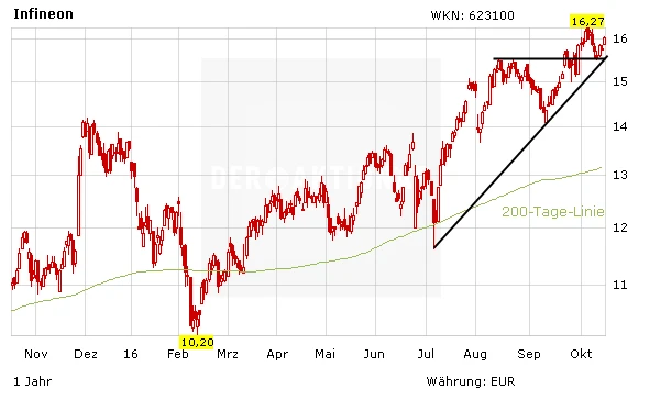 Charttechnisch ist das Bild bei Infineon weiterhin erfreulich. Der langfristige Aufwärtstrend ist intakt und die nächste Attacke auf das kürzlich erreichte Mehrjahreshoch bei 16,27 Euro dürfte bald erfolgen. Gelingt der Ausbruch, wäre der Weg nach oben vorerst frei. Nach unten sichert die horizontale Unterstützung bei 15,50 Euro vor möglichen Rücksetzern ab.