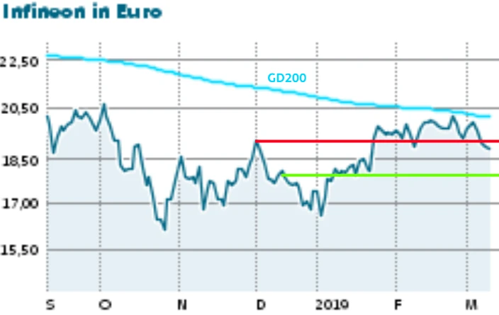 Die Infineon-Aktie befindet sich seit dem 25. Januar im Konsolidierungsmodus. Ein erster Versuch, den charttechnischen Widerstand bei 20 Euro nachhaltig zu überwinden, ist an der 200-Tage-Linie bei 20,25 Euro gescheitert. Neben der Sorgen um US-Strafzölle für europäische Autoimporte sorgen die Pläne des japanischen Wettbewerbers Renesas für schlechte Stimmung. Die Japaner generieren rund die Hälfte ihres Umsatzes mit Chips für die Autoindustrie. Im schwachen Marktumfeld wird heute mit dem Abrutschen unter die 19-Euro-Marke ein weiteres Verkaufssignal generiert. Die nächste Unterstützung vor dem Jahrestief wartet nun bei 18 Euro.