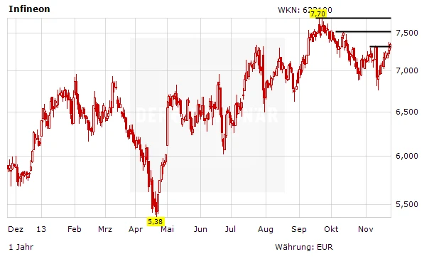 Die Aktie des Chipherstellers Infineon hat richtig Fahrt aufgenommen und einen steilen Aufwärtstrend herausgearbeitet. Eine erste Hürde lauert jetzt im Bereich von 7,35 Euro. Gelingt es der Aktie, diese Marke hinter sich zu lassen, ist schnell mit weiteren Gewinnen zu rechnen. Die nächsten Widerstände liegen darüber bei 7,50 und 7,70 Euro.