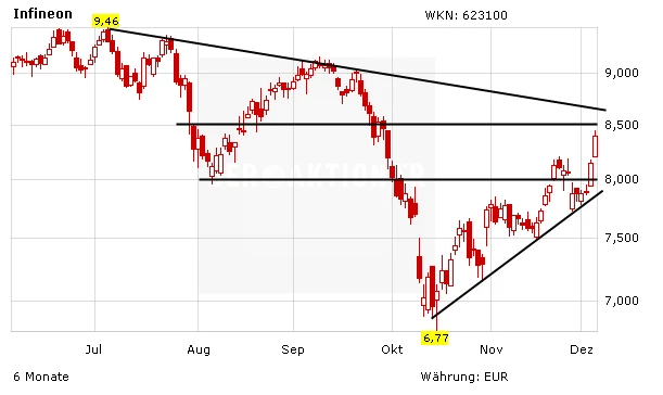 Das Chartbild bei Infineon hat sich zuletzt deutlich aufgehellt. Die Aktie notiert vor dem Widerstand bei 8,50 Euro. In einem weiterhin positiven Marktumfeld könnte der Ausbruch gelingen. Dies würde ein weiteres Kaufsignal generieren. Im Anschluss wäre der Weg bis 9,00 Euro frei.
