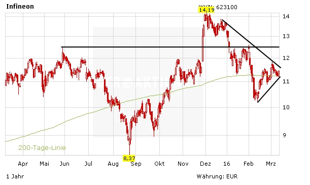 Der Ausbruch lässt weiter auf sich warten. Nach wie vor hängt die Infineon-Aktie im Bereich von 11,50 Euro fest. Inzwischen treffen an dieser Marke sowohl der seit Jahresbeginn gültige Abwärtstrend als auch der seit Anfang Februar intakte Aufwärtstrend aufeinander. In den kommenden Tagen dürfte sich zeigen, in welche Richtung der DAX-Titel vorerst läuft.