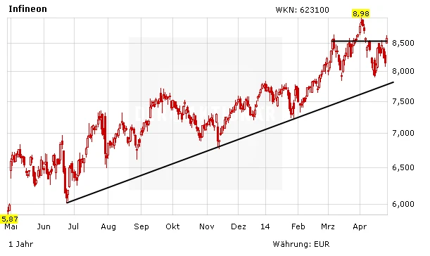Auch DER AKTIONÄR bleibt optimistisch für die Infineon-Aktie. Durch das Kursplus notiert die Aktie im Bereich des horizontalen Widerstands bei 8,60 Euro. Gelingt der Ausbruch, ist der Weg vorerst frei bis zum alten Jahreshoch bei 9,00 Euro.