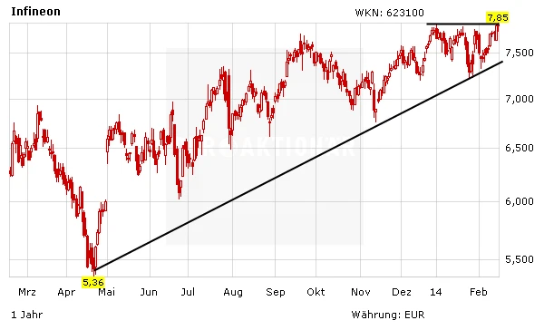 Zu Beginn der Handelswoche knüpft Infineon an dem positiven Wochenabschluss an. Der DAX-Wert kletterte im Handelsverlauf über die Marke von 7,80 Euro. An dieser Hürde scheiterten die Papiere des Münchner Technologiekonzerns in der Vergangenheit bereits mehrfach. Gelingt dieses Mal der nachhaltige Ausbruch, wartet die nächste Hürde bei 8,00 Euro. Darüber wäre dann Luft bis zum Hoch aus dem Jahr 2011 bei 8,32 Euro.