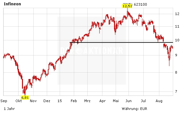 Analyst Thomas Becker von der Commerzbank hat Infineon von "Add" auf "Buy" hochgestuft. Das Kursziel ließ er bei 11,50 Euro. Die Situation in China habe sich für den Chiphersteller in den vergangenen Wochen nicht zusätzlich verschlechtert, schrieb Thomas Becker. Der Orderbestand stütze weiterhin die Quartalsprognose der Münchener. Es gebe keinen Grund, wegen der China-Turbulenzen in Panik zu verfallen, so der Experte. Sobald deutlich werde, dass Infineon sich in einem Umfeld mit schwächerem Wachstum besser behaupte als der Wettbewerb, sollte ein Ansturm von Anlegern einsetzen.