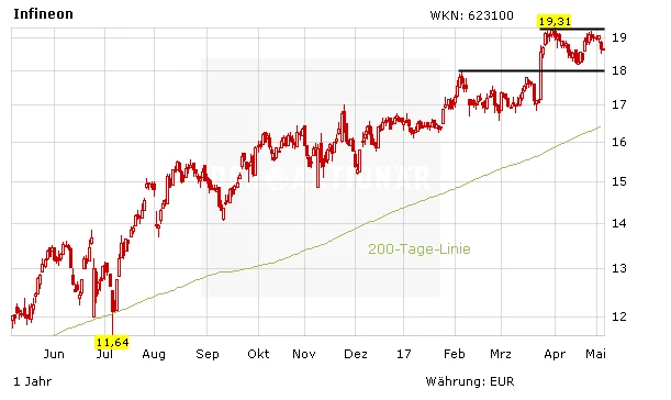 Die Zahlen wurden von den Experten allerdings nicht nur negativ beurteilt. Harald Schnitzer von der DZ Bank betonte, dass Infineon ein starkes zweites Geschäftsquartal hinter sich habe und schneller wachse als die Branche. Wegen der Marktanteilsgewinne im Automotive-Segment, des langfristigen Auftragspolsters und der steigenden Industrienachfrage hat er sein Kursziel von 18,50 auf 21,50 Euro erhöht und die Kaufempfehlung bestätigt.