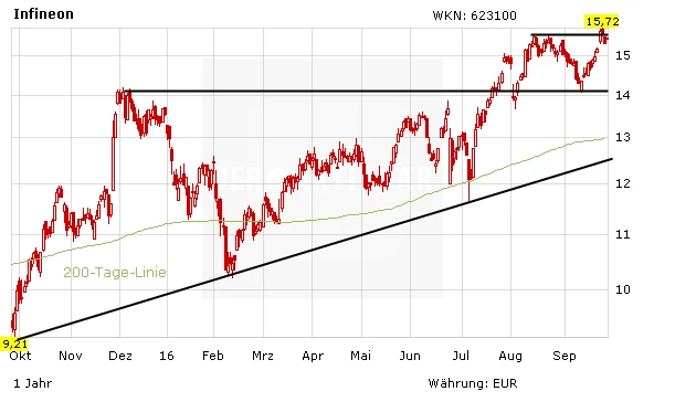 Das Bankhaus Lampe hat Infineon am Montag auf die „Alpha Liste“ gesetzt. Damit wird der Aktie ein starkes Aufwärtspotenzial zugesprochen. Positiv gestimmt bleibt auch die US-Bank JPMorgan. Analyst Sandeep Deshpande hat die Einstufung auf „Overweight“ belassen und das Kursziel von 16 auf 18 Euro angehoben. Mit dem neuen Schwung von der Analystenseite nähert sich die Aktie dem jüngst erreichten Mehrjahreshoch bei 15,72 Euro nun wieder an.