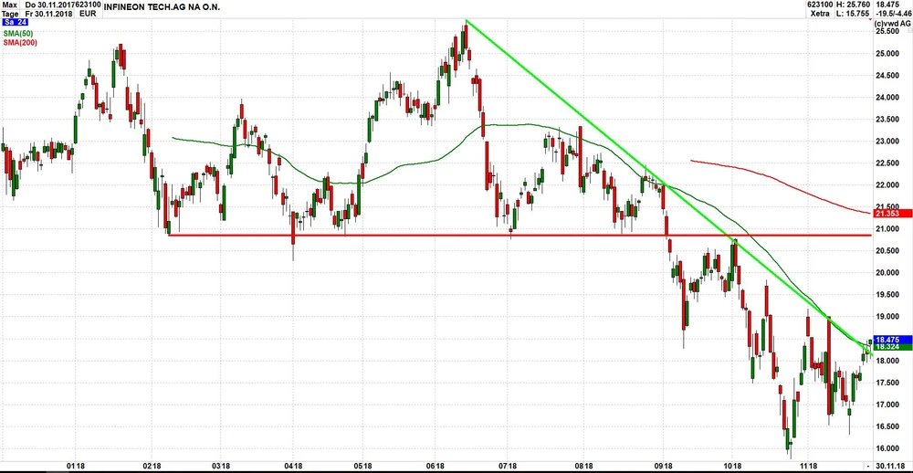 Die positive Stimmung dürfte sich auch bei Infineon entsprechend positiv auf den Kurs niederschlagen. Charttechnisch ist ohnehin ein frisches Kaufsignal im Markt, nachdem Infineon in der zurückliegenden Woche rund fünf Prozent zulegen und den seit Juli gültigen Aufwärtstrend nach oben durchbrechen konnte. Damit besteht Anschlusspotenzial bis zum horizontalen Widerstand bei knapp 21 Euro.