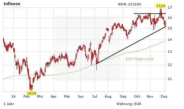 Eine weitere Übernahme in der Branche ist durchaus möglich, allerdings sollten Anleger auch aufgrund der Bedenken gegenüber chinesischen Investoren nicht komplett auf dieses Pferd setzen. Der Vorteil bei Infineon: Der Konzern ist in den wachstumsstarken Sparten mit Chips für Auto- und Industriekonzerne stark aufgestellt. Das attraktive Chartbild spricht ebenfalls für ein Investment. Anleger lassen die Gewinne laufen. Der Stoppkurs liegt bei 14,00 Euro.