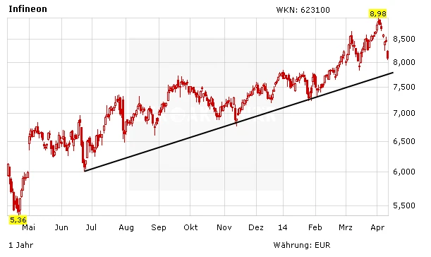 Der Halbleiterkonzern aus dem DAX veröffentlicht am 29. April seine Zahlen für das zweite Quartal des laufenden Jahres. Marktbeobachter rechnen im Vorfeld mit einem Gewinn von 0,089 Euro je Aktie und einem Umsatz in Höhe von 1 Milliarde Euro. Auf der Hauptversammlung von Infineon Mitte Februar hatte Konzernchef Reinhard Ploss bereits einen guten Ausblick zu bieten: "Im laufenden Geschäftsjahr erwarten wir ein deutliches Plus bei Umsatz und Ergebnis – also nachhaltiges profitables Wachstum."