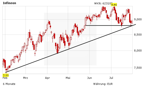 Im dritten Geschäftsquartal bis Ende Juni hatten die Münchner ihren Gewinn vor Zinsen, Steuern und Sondereffekten deutlich gesteigert. Mit 170 Millionen Euro lag dieses Segmentergebnis 16 Prozent höher als im Vorquartal, das in der Halbleiterbranche wegen schwankender Preise als Vergleich gilt. Der Umsatz kletterte um sechs Prozent auf 1,11 Milliarden Euro - damit blieben 15,3 Prozent der Erlöse als operativer Gewinn übrig. Auch unter dem Strich konnte Infineon zulegen: Der Überschuss kletterte um 15 Prozent auf 143 Millionen Euro. Vor allem die Industriesparte sowie das Geschäft mit deutschen Autobauern treiben das Geschäft des Konzerns an.