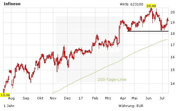 Hintergrund: In der vergangenen Woche hat der Halbleiterzulieferer Siltronic die Prognose erhöht und damit der gesamten Branche Schwung verliehen. Am 2. August wird der DAX-Konzern dann selbst Zahlen zum dritten Quartal des laufenden Geschäftsjahres präsentieren. Die Experten erwarten einen Umsatz von 1,83 Milliarden Euro und ein Ergebnis pro Aktie von 0,23 Euro.