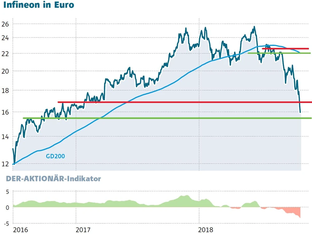Die Kursentwicklung bei Infineon spricht Bände: Die Befürchtungen, dass auch der deutsche Chip-Riese enttäuschen wird, sind groß. Das bietet allerdings auch Chancen für eine positive Überraschung, da möglicherweise auch zu viel negatives eingepreist ist. Die Aktie hat seit Anfang September ein Viertel ihres Wertes verloren, seit dem Hoch bei 25,76 Euro sind es sogar fast 40 Prozent.