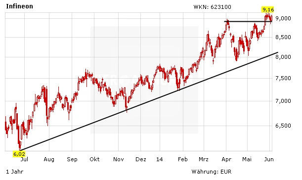 Das durchschnittliche Kursziel von insgesamt 35 Analysten, die durch die Nachrichtenagentur Bloomberg befragt wurden, beträgt 9,25 Euro. Im Vergleich dazu ist die Privatbank Berenberg sehr pessimistisch. Die Zahlen des abgelaufenen Quartals eine andere Sprache. Verglichen mit dem ersten Quartal hatte Infineon zwischen Januar und März den Umsatz um sieben Prozent auf 1,05 Milliarden Euro gesteigert. Unter dem Strich legte der Überschuss um mehr als 40 Prozent auf 124 Millionen Euro zu.