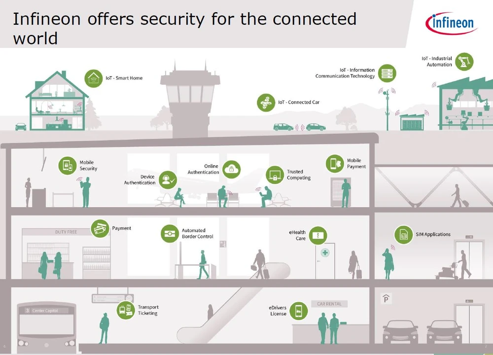 Infineon bietet für sämtliche Bereiche Security-Lösungen an. Smart Home, vernetzte Fahrzeuge, Industrie 4.0 sind ohne entsprechende Sicherheitssysteme nicht praktikabel. Viele Geräte- und Systemhersteller haben allerdings schlichtweg nicht das Security-Know-how und müssen auf Spezialisten wie Infineon zurückgreifen.