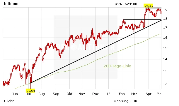 Infineon konnte den Umsatz im Vergleich zum Vorquartal um 7,4 Prozent auf 1,77 Milliarden Euro steigern. Das operative Ergebnis kletterte sogar um 20 Prozent auf 296 Millionen Euro. Damit hat der Konzern eine Marge von 16,8 Prozent erreicht. Insgesamt lag das Zahlenwerk zwar im Rahmen der Erwartungen. Wegen der deutlichen Kursgewinne zuletzt hatten Anleger allerdings noch mehr vorausgesetzt, um die Aktie weiter anzutreiben.