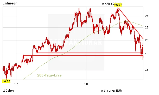 Auch charttechnisch sieht es für Infineon schlecht aus. Die wichtige Unterstützungszone im Bereich 18 Euro hat nicht gehalten – der Abwärtstrend geht unbeirrt weiter. Anleger behalten den Stopp des AKTIONÄR bei 17,25 Euro im Blick.