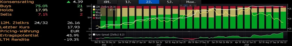 Entsprechend positiv blicken auch die Analysten in die Zukunft. 21 Analysten empfehlen die Infineon-Aktie zum Kauf, 5 sehen eine Halte-Position, nur 2 raten vom Papier ab. Das Konsensziel der Analysten liegt mit 26,16 Euro entsprechend weit über dem aktuellen Kurs. Doch auch positiv gestimmte Analysten können die Infineon-Aktie aktuell nicht bewegen. Dabei gab es in den vergangenen Tagen sogar zwei Hochstufungen.