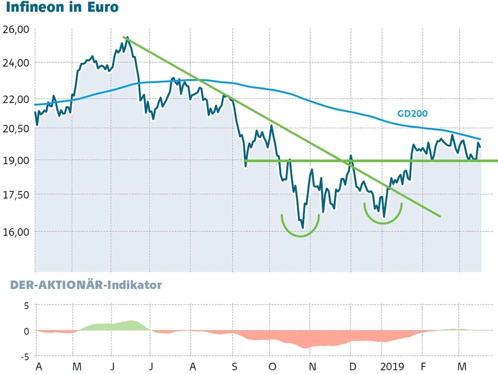Vorwochenschluss gab die Aktie von Infineon noch einmal richtig Gas. Bedingt durch einen guten Ausblick beim Halbleiterkonzern Broadcom konnte der Wert sogar eine wichtige Marke nehmen. Heute fehlt der Aktie allerdings die Dynamik. Im frühen Handel bildet Infineon mit einem Minus von knapp einem Prozent das Schlusslicht im DAX.