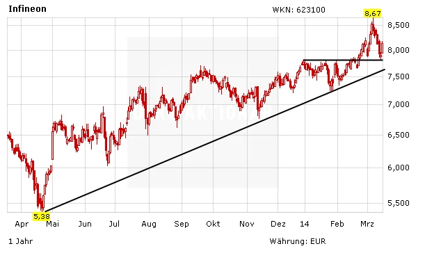 Die Infineon-Aktie notierte zuletzt im Oktober 2007 im zweistelligen Bereich. Investierte Anleger bleiben dabei, auch für einen Neuseinstieg ist es noch nicht zu spät. DER AKTIONÄR spekuliert in seinem Derivate-Musterdepot daher weiter auf steigende Kurse.