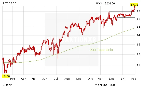 Die Wachstumsraten im Segment ATV (Energieeffizienz, Elektromobilität, Assistenzsysteme, Vernetzung) lägen deutlich über dem allgemeinen Marktwachstum, erklärt Harald Schnitzer von der DZ Bank. Infineon habe vor allem mit einem starken Auftragseingang überzeugt. Der Experte hat seine Kaufempfehlung bestätigt und sieht den fairen Wert der Aktie bei 18,50 Euro.