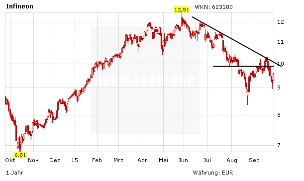 Sein Anlagevotum hat der Analyst auf „Buy“ mit einem Kursziel von 13 Euro belassen. Ausgehend vom aktuellen Kursniveau traut er der Infineon-Aktie damit ein Kurspotenzial von rund 35 Prozent zu.