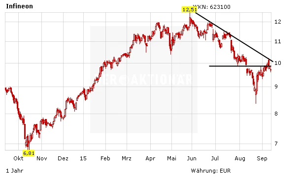 Die Infineon-Aktie wurde im August ausgestoppt und steht seitdem auf der Watchlist des AKTIONÄR. In Anbetracht der volatilen Märkte empfiehlt es sich, vor dem Einstieg eine klare Trendwende abzuwarten. In jedem Fall sollte die Aktie aber erst die Marke von 9,80 Euro dauerhaft zurückerobern.