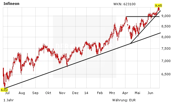 Durch die Rallye der letzten Wochen hat die Infineon-Aktie alle charttechnischen Widerstände aus dem Weg geräumt. Zweistellige Kurse sind demnächst möglich. Die Unterstützung bei knapp neun Euro sichert bei einem Rücksetzer vor größeren Verlusten ab. Der langfristige Aufwärtstrend bleibt derweil klar intakt.