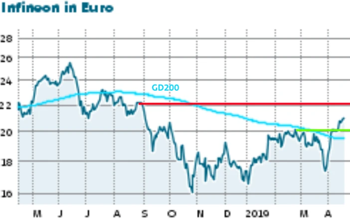 Die Aktie von Infineon-Technologies hat den horizontalen Widerstand bei 20,00 Euro nachhaltig überwunden. Damit kommt zu den drei potenziellen Kurstreibern noch ein vierter Punkt hinzu: die Charttechnik. Bei Infineon steht die Kursampel mit dem jüngsten Kaufsignal komplett auf Grün. Hält das positive Momentum an, könnte die Aktie nun einen Durchmarsch bis 22,00 Euro versuchen. Die Deutsche Bank sieht ihren Top-Pick sogar erst bei 23,00 Euro fair bewertet.
