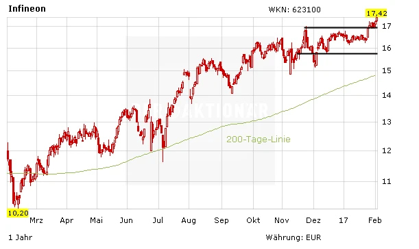 Dank guter Zahlen führt die Infineon-Aktie den DAX am Donnerstag an. Die Aktie hat im frühen Handel bereits ein neues Mehrjahreshoch aufgestellt. Der Weg nach oben wäre nun frei. Vor allem das starke Geschäft mit Chips für die Autobranche lässt den Konzern optimistisch in die Zukunft blicken.