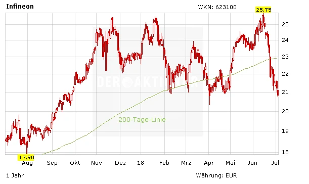 Die Aktie von Infineon ist aktuell der zweitgrößte Verlierer im DAX. Noch härter erwischt es Siltronic, die zur Stunde über acht Prozent verlieren. Für den AKTIONÄR ist Infineon weiterhin ein Kauf. Allerdings sollte der Stopp bei 20,50 Euro beachtet werden. Die Aktie von Siltronic wird vom AKTIONÄR derzeit nicht zum Kauf empfohlen.