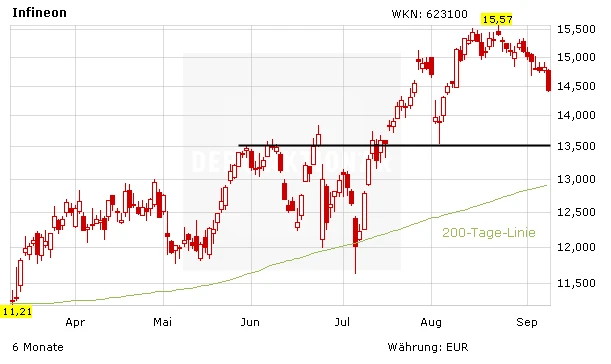 Mit einem Minus von rund vier Prozent innerhalb einer Woche zählt Infineon zu den schwächeren DAX-Werten der Handelswoche. Charttechnisch rücken wichtige Marken in den Fokus. Einerseits bietet das Verlaufstief vom Monat August ersten Halt – fällt diese Unterstützung rückt die wichtige 200-Tage-Linie im Bereich von 13 Euro ins Visier der Anleger. Vorerst ist aber kein Bruch des Aufwärtstrends zu erwarten.