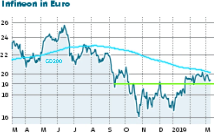 Die Infineon-Aktie befindet sich seit dem 25. Januar im Konsolidierungsmodus. Ein erster Versuch, den charttechnischen Widerstand bei 20 Euro nachhaltig zu überwinden, ist an der 200-Tage-Linie bei 20,25 Euro gescheitert. Nun droht ein Rücksetzer. Neben der Sorgen um US-Strafzölle für europäische Autoimporte sorgen die Pläne des japanischen Wettbewerbers Renesas für schlechte Stimmung.