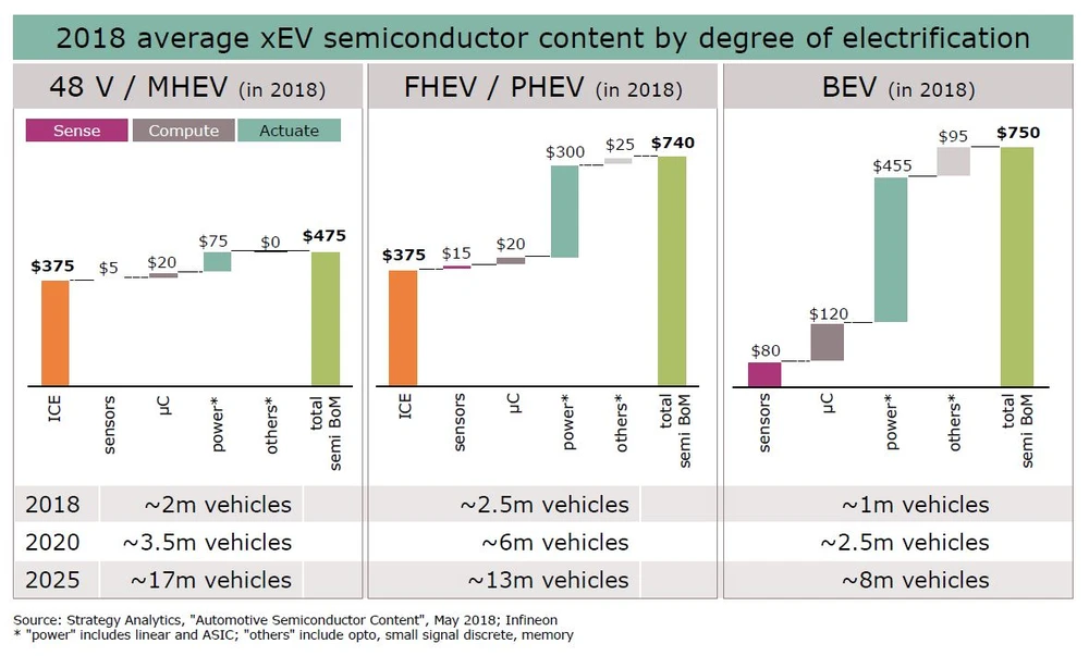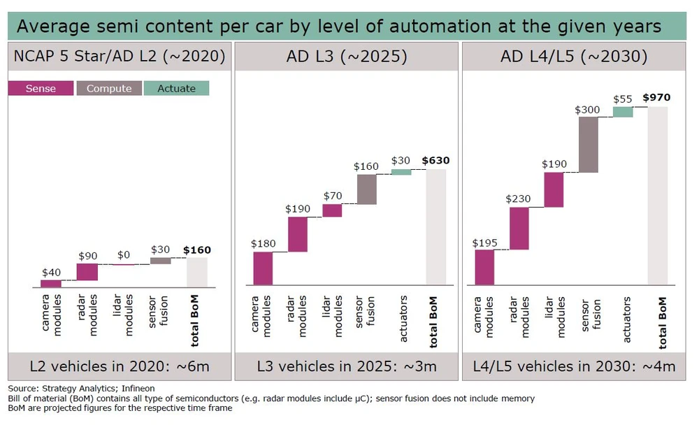 In einem Atemzug mit Elektroautos werden im Regelfall auch autonome Fahrzeuge genannt. Infineon profitiert auch davon, dass – nicht nur in selbstfahrenden Fahrzeugen – immer mehr elek­tronische Helfer verbaut werden. Kameras, Radar-, Lidar-Sensoren, Ultraschall-Sensoren et cetera mit deren Hilfe sich die Fahrzeuge in der Umgebung orientieren und sich selbst oder den Fahrer vor Gefahren warnen. Ähnlich wie bei den Leistungshalbleitern wird der Zielmarkt für Infineon mit steigendem Automatisierungsgrad größer. Aktuell besitzt ein gut ausgestattetes Fahrzeug mit Cruise Control und Lane Assist einen Automatisierungsgrad Level 2 und hat damit Sensor- und Aktuator-Chips im Wert von 160 Dollar unter der Haube. Bei Vollautomatisierung wird der Halbleiterinhalt einen Wert von 930 Dollar erreichen.