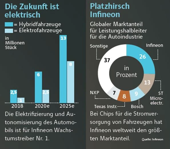 Infineon ist in sämtlichen Disziplinen, die mit elektrischen und autonomen Fahrzeugen zusammenhängen, weit vorne dabei. 65 Prozent des Umsatzes macht Infineon mit Leistungshalbleitern, also Chips für die Stromversorgung. Die Münchener beliefern fast alle Hersteller, sogar den Elektropionier Tesla. Mit anderen Worten: Ohne Infineon-Chips kein E-Auto oder Hybrid. Auch bei der La­deinfrastruktur und der regenerativen Energieerzeugung ist der Chipspezialist hervorragend positioniert.