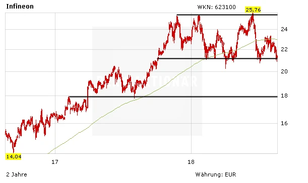 Seit Anfang 2015 hat Infineon seinen Börsenwert verdoppelt. Im November 2017 ist die Aktie dann aber in den Konsolidierungsmodus übergegangen. Seitdem pendelt der Kurs in einer breitgefassten Range zwischen 21,00 und rund 25,50 Euro seitwärts. Darauf kommt es jetzt an.