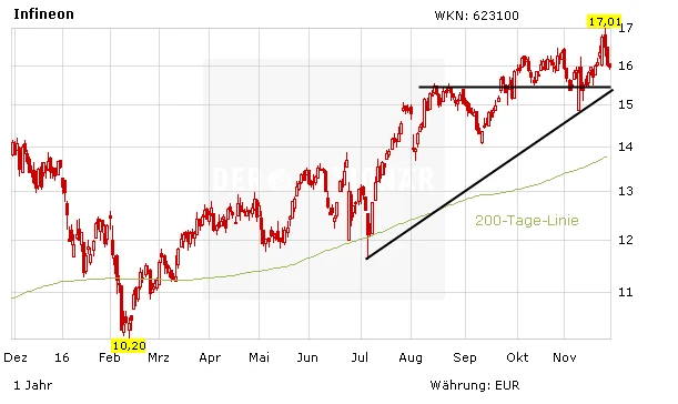 Die Infineon-Aktie notiert nach den Quartalszahlen weiter im Bereich der 16-Euro-Marke. Es bleibt spannend, in welche Richtung sich der DAX-Titel entwickelt. Das Mehrjahreshoch bei 17,03 Euro, das unmittelbar nach den Zahlen erreicht wurde, ist aber nach wie vor nicht weit entfernt.