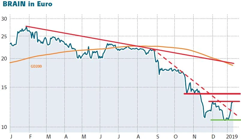 Mit dem heutigen Kursplus gibt die Aktie von BRAIN wieder ein erstes positives Signal ab. Der kurzfristige Abwärtstrend konnte überwunden werden. Nun gilt es das Dezemberhoch und anschließend die 14-Euro-Marke zu überwinden. Gelingt dies, würde sich das charttechnische Bild deutlich aufhellen. Anleger bleiben investiert, sichern ihre Position aber mit einem Stopp bei 9,40 Euro nach unten ab. Die Aktie eignet sich nur für risikobereite Investoren.