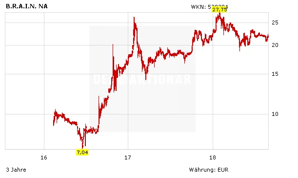 BRAIN ist ein Spezialist im Bereich der Weißen Biotechnologie (das Unternehmen erforscht hochinnovative Produkte für die Industrie). Zahlreiche klangvolle Namen stehen auf der Partnerliste. Die Forschungsarbeit von BRAIN dürfte in Zukunft immer gefragter werden. Derzeit wird das Potenzial wohl auch aufgrund der Komplexität des Geschäfts noch unterschätzt. Gelingt der Aktie der Sprung über den Widerstand bei 23,20 Euro, können Anleger wieder zugreifen und sich ein paar Stücke ins Depot legen. Die Aktie ist ein Top-Nischenplayer, der langfristig orientierten Anlegern noch viel Freude bereiten dürfte.