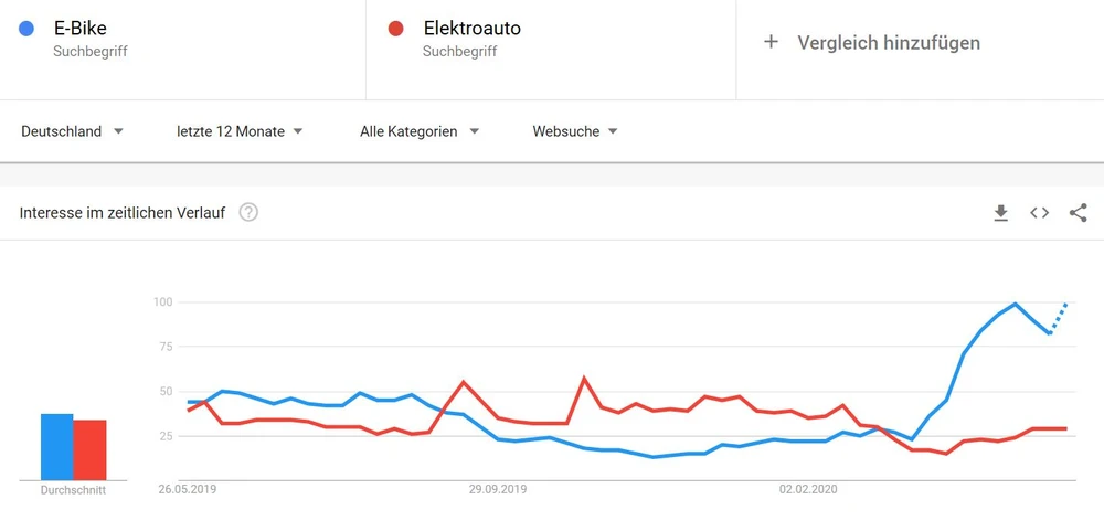 Die Corona-Krise habe sogar viele Nicht-Fahrradfahrer aufs Bike gebracht. Das Thema E-Bike erhalte derzeit einen „nachhaltigen Boost“. Schmitt bestätigt, was die Google-Trends-Grafik zeigt: Das Interesse am Auto schwindet in diesen Tagen. In sind plötzlich Batterie-Räder. „In Anbetracht einer zu erwartenden Rezession, gehen wir davon aus, dass das Auto an Bedeutung verlieren wird, alternative individuelle Verkehrsmittel, regionale Freizeitbeschäftigungen sowie Fitness-Aktivitäten hingegen deutlich gewinnen werden“, so der Branchen-Experte.
