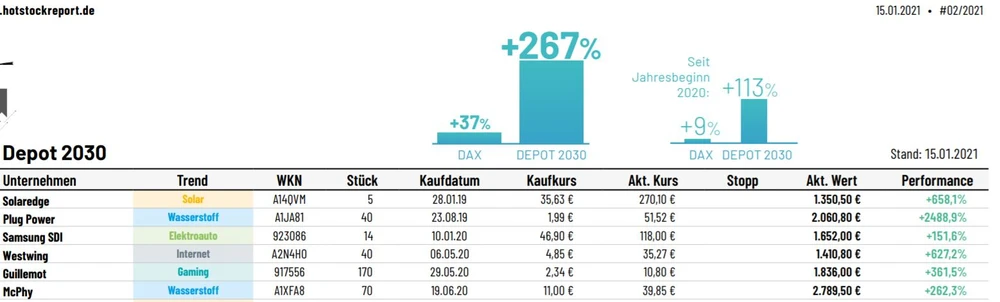 Seit Kauf der Aktie im Jahr 2019 ins Depot 2030 des AKTIONÄR Hot Stock Report beträgt der Gewinn 2.500 Prozent. Das Depot 2030 hat bereits im Jahr 2020 rund 100 Prozent zugelegt und startet furios ins neue Jahr. Am Freitag ist die neue Ausgabe erschienen – mit einem neuen Top-Pick für 2021. Ein Fondsmanager sagt uns, nach Wasserstoff ist dieser Sektor nach spektakulären News nun „the next big thing“. Wir kaufen den neuen Favoriten ins Depot 2030.