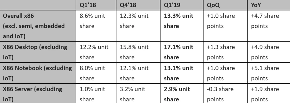 Die folgenden Daten von Mercury Research verdeutlichen, wie der Marktanteil von AMD in den vergangenen Quartalen zugenommen hat: