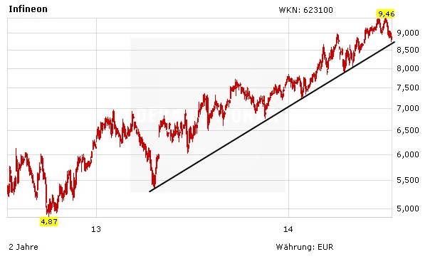 Die Aktie von Intel konnte bereits in den vergangenen Wochen deutliche Kursgewinne verbuchen und erreichte zuletzt sogar ein neues Mehrjahreshoch. Anleger sind gut beraten, weiter investiert zu bleiben. Zur Absicherung sollte der Stopp auf 17,50 Euro nachgezogen werden. Von der guten Entwicklung bei Intel dürfte auch der DAX-Konzern Infineon profitieren können. In den vergangenen Tagen war das Papier auf Konsolidierungskurs gegangen, dürfte aber ebenfalls bald seinen Weg nach oben fortsetzen.