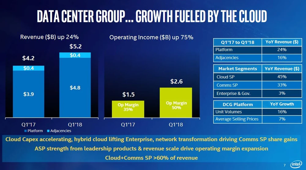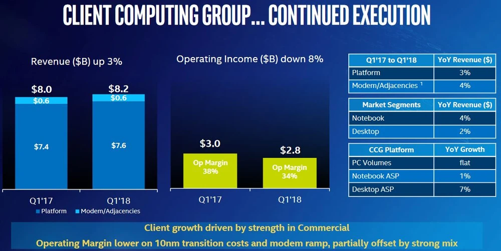 Intels größtes Segment Client Computing erzielte Umsätze von 8,2 Milliarden Dollar. Die operative Marge sank jedoch auf 34 Prozent. Hier ist klar die neue Konkurrenz am Markt in Form von AMD zu spüren.