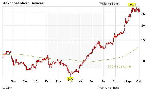 Die Analysten von Baird haben AMD herabgestuft von „Equal Weight“ auf „Underweight“ und das Kursziel auf 20 Dollar gesenkt. Zwar sei der Server-Chip von AMD beeindruckend, schrieb der Analyst, doch Intel werde mit eigener neuer Chip-Architektur antworten. Nach der anhaltenden Rallye seien die guten Neuigkeiten jedoch bereits eingepreist.