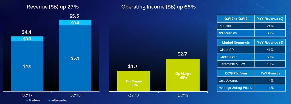 Hervorragend entwickelte sich erneut die „Data Center Group“. Der Umsatz legte von 4,4 Milliarden auf 5,5 Milliarden Dollar zu. Gegenüber dem Vorjahr entspricht dies einem Wachstum von 26 Prozent. Ebenfalls positiv ist die starke Margenentwicklung innerhalb der Zukunftssparte: Die operative Marge stieg von 38 auf 49 Prozent und sorgte für eine rasante Steigerung des operativen Gewinns von 65 Prozent auf 2,7 Milliarden Dollar.
