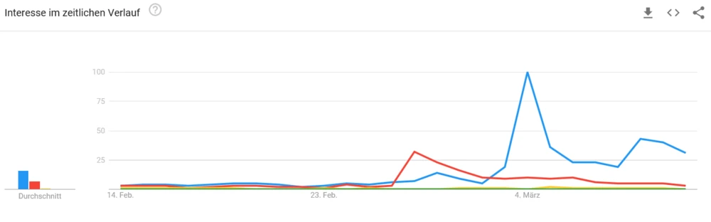 Nur noch einen Tag bis zur Vorstellung des neuen Tesla Model Y. Das Interesse ist bereits immens, wie folgende GoogleTrends-Grafik zeigt. Der vor zwei Wochen vorgestellte Polestar 2 kommt nicht an den Hype heran, den das Model Y bereits jetzt im Netz erzeugt. Die Hoffnung der Tesla-Bullen: Die Reservierungen erreichen nach einem gelungenen Event von Elon Musk zumindest im Ansatz die überwältigende Anzahl von 300.000, die 2016 Tesla nach der Model-3-Enthüllung innerhalb weniger Tage einsammeln konnte. Noch nicht relevant im Gespräch ist hingegen die Elektroauto-Offensive der VW-Gruppe. Doch die Leistungsdaten von Audi Q4 oder VW Neo können sich schon sehen lassen. Das Model Y muss sich am Ende mit diesen drei Rivalen messen. Ein kurzer Überblick.