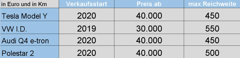 Auch wenn das Design des VW biederer ist als das von Tesla – alleine aufgrund der Preis-Leistungsdaten scheint ein gewisser Erfolg vorprogrammiert: Jürgen Stockmann, Markenvorstand hält es für möglich, dass die Launch Edition bereits ausverkauft sein wird, bevor das Auto im September offiziell vorgestellt wird. Die Vorbestellungen beginnen bereits am 8. Mai. VW will 2020 bereits 200.000 elektrifizierte Autos verkaufen. Ganz frisch die Meldung, dass VW beschleunigt und bis 2025 ganze 30 (bisher 20) batteriebetriebene Modelle anbieten will. Fazit: Wird am Marktanteil von Tesla knabbern – doch SUV-Fans und Puristen setzen auf das Model Y.