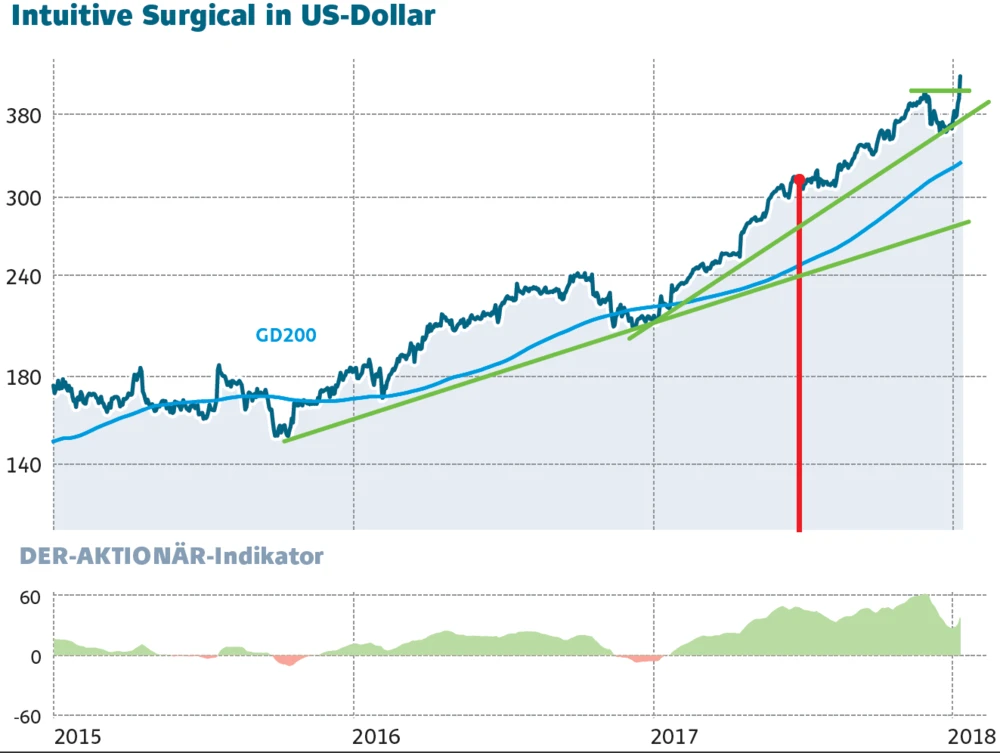 Mit dem Ausbruch auf ein neues Allzeithoch hat die Aktie ein starkes Kaufsignal generiert. Trotz des steigenden Konkurrenzdrucks in Form von Mazor Robotics, Medtronic und Verb Surgical (ein Gemeinschaftsunternehmen von Alphabet und Johnson & Johnson) sollten Anleger bei dem trendstarken Titel an Bord bleiben und kein Stück aus der Hand geben, solange der steile Aufwärtstrend bei der Intuitive-Surgical-Aktie intakt ist.