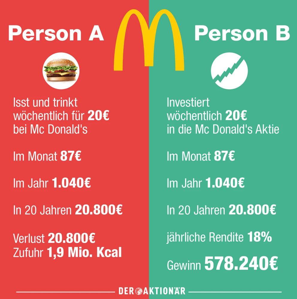 Beim Verzicht auf zwei Besuche bei McDonald’s pro Woche (à zehn Euro) hätte man nicht nur etliche Kalorien eingespart. Hätte man von dem Geld McDonald’s-Aktien gekauft, wäre ein nettes Vermögen zusammengekommen: